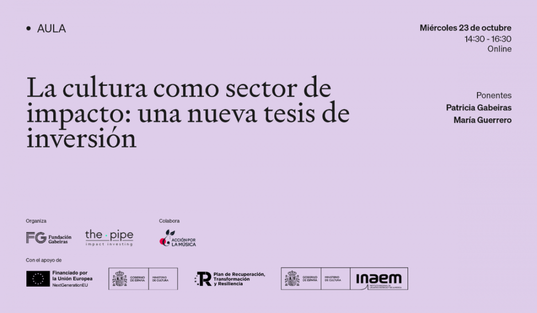 El próximo miércoles 23 de octubre organizamos un nuevo encuentro de Aula Gabeiras para reflexionar acerca de si la cultura, como bien básico y de primera necesidad, debería atraer la inversión de impacto para su financiación.