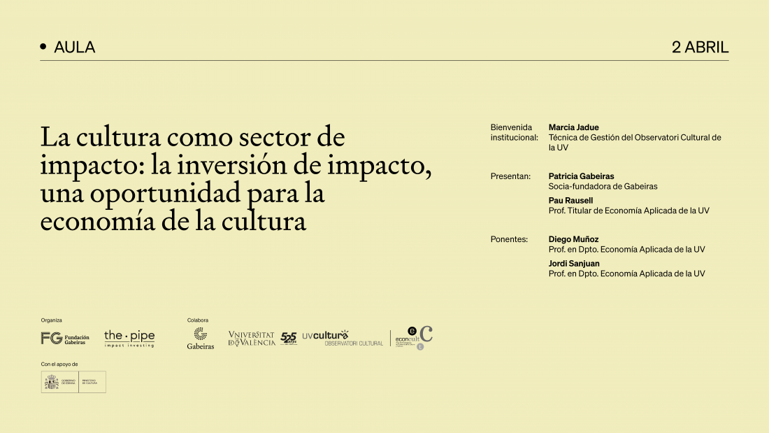 El miércoles 2 de abril tendrá lugar en el Centre Cultural La Nau de la Universitat de València el último encuentro del ciclo de Aulas para innovar el modelo de financiación de la cultura, organizado por Fundación Gabeiras y The Pipe – Impact Investing, y con la colaboración de Gabeiras. En esta ocasión, se realiza, además, en colaboración con la Unidad de Investigación en Economía de la Cultura de la Universitat de València y el Observatori Cultural de la UV.